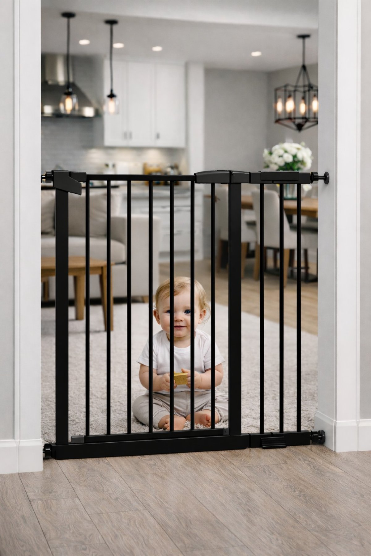 Robustní, spolehlivá zábrana s celou řadou bezpečnostních prvků. Velmi jednoduchá montáž pomocí rozporových šroubů, tudíž bez jakéhokoliv zásahu do zdi nebo obložení dveří. Bezpečnostní zámek, při otevření dvířek 90 stupňů
